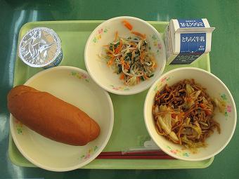 給食は、やきそば、牛乳、ミニ黒パン、ニラともやしのツナ和え、県産ヨーグルトでした。