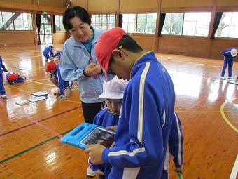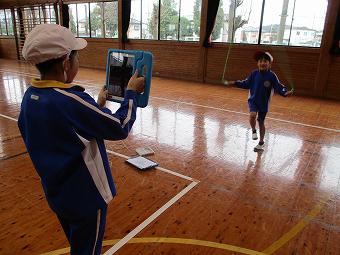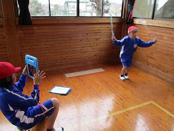 1年生と6年生が合同体育でなわとびの学習を行いました。1年生にとっては、教えてもらえることによって、6年生にとっては、アドバイスしたりお世話したりすることによって、本校で育成すべき資質・能力、自尊感情や自己有用感、学び合いなどを伸ばすことをねらいとしたピアサポート学習です。6年生はタブレットで1年生のなわとびの様子を録画してアドバイスをしたり、模範跳びをしたりしていました。1年生も楽しそうに、素直に6年生のアドバイスを聞きながら、一生懸命練習していました。