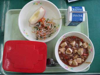 給食は、ご飯、麻婆豆腐、ナムル、リンゴ、牛乳でした。