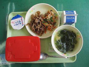 本日の給食は、ごはん、牛乳、すきやきふうに、おかかあえ、納豆です。