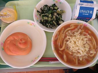 今日の給食は、「楡木小アイデア献立」でした。内容は、カレーうどん、ほうれん草の海苔合え、ミニ県産米粉パン、レモンタルトでした。