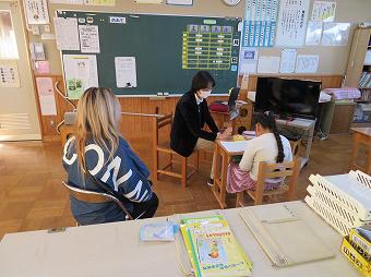 1年生がALTと外国語活動を行いました。アルファベットの発音の仕方を動作とともに身に付けるジョリーフォニックスなど、楽しく、活動しながら英語の基礎を学んでいました。
