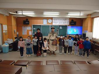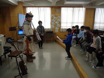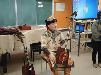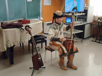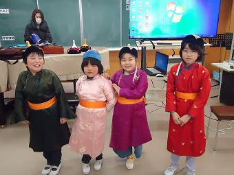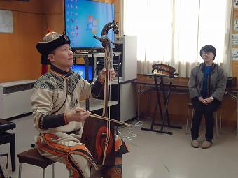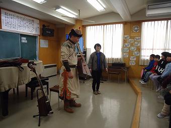 2年生の国語に「スーホの白い馬」というモンゴルを舞台にしたお話があります。今回は、その学習にちなんで、モンゴルの伝統楽器「馬頭琴」の演奏をモンゴルのプロ演奏家をお招きして、聴かせていただきました。最初にモンゴルの生活などを写真スライドを交えてお話いただきました。その後、プロ演奏家の方の歌と演奏を聴いたり、モンゴルの伝統衣装を着せていただいたりました。迫力のある演奏、歌に、どの子も引き込まれていました。モンゴルに対する理解が深まりました。来校いただきました皆様、大変ありがとうございました。