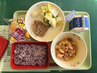 今日の給食は、「初午献立」黒米ご飯、鳥の香味焼き、即席漬け、しもつかれ、ミカンシャーベットでした。
