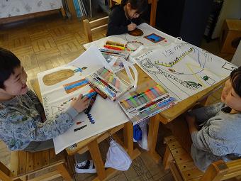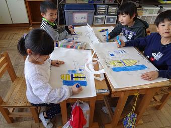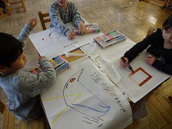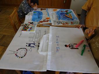 1年生が図工の時間に作品バックを作りました。自分が1年間、作ってきたさまざまな作品を入れるバックです。白い布に、それぞれ思い思いの絵を描いていました。