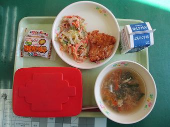 給食は、「南押原中2年家庭科献立」ということで、ご飯、牛乳、鶏の唐揚げ、ごぼうサラダ、かき玉汁、豆乳プリンタルトでした。