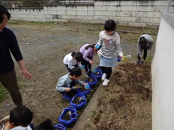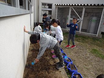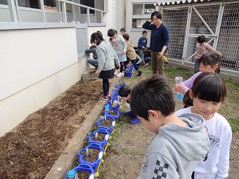1年生がチューリップの世話を行いました。どの子も一生懸命に世話をしていました。