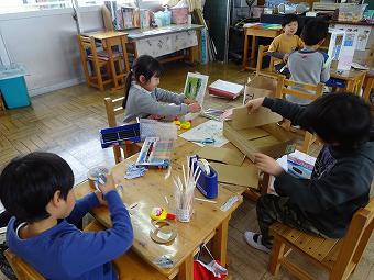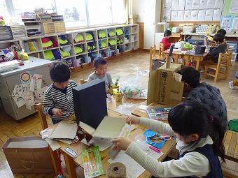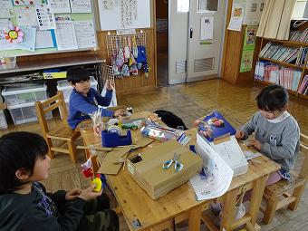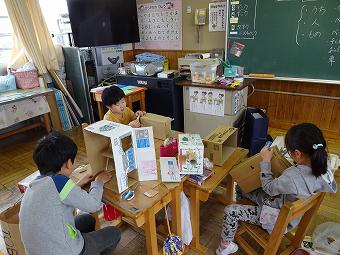 1年生が図工で「夢の町、三丁目」という学習を行いました。自分の町を作る学習です。どの子も夢中になって自分の夢の町を制作していました。