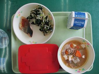 今日の給食は、ごはん、鯖のスタミナ焼き、海苔和え、豚汁、牛乳でした。