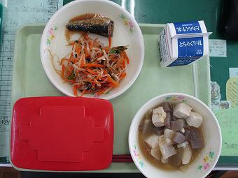 給食は、ごはん、牛乳、いわしごま味噌煮、おひたし、田舎汁でした。
