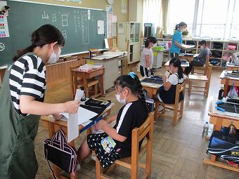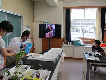 6年生の理科で、葉の蒸散の学習を行いました。顕微鏡を見る順番の場所に印をつけたり、ICTを効果的に使ったりして、感染症対策を施しながら、授業を行いました。子供たちは、とても意欲的に自分の考えを述べていました。先輩の授業ということで、他学年の先生も参観に来ていました。