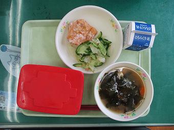 給食は、わかめごはん、鶏の唐揚げ、浅漬け、味噌汁、牛乳でした。