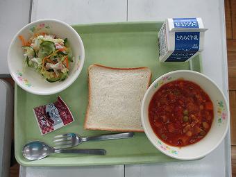 給食は、厚切り食パン、チョコクリーム、チリコンカン、コールスローサラダ、牛乳でした。