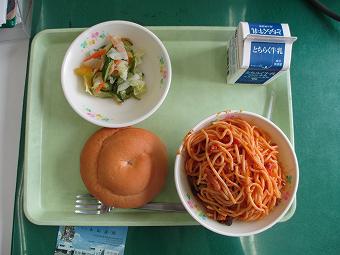 給食は夏野菜スパゲティ、フレンチサラダ、ミニバターロール、牛乳でした。