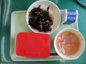 給食は、ご飯、あじ一夜干し、五目煮、豚汁、牛乳でした。