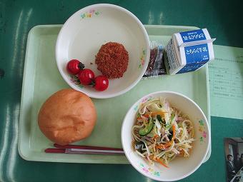 給食は、冷やし中華、メンチカツ、ミニ丸パン、ミニトマト、牛乳でした。