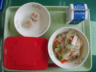 給食は、牛乳、ごはん、えびしゅうまい、八宝菜でした。