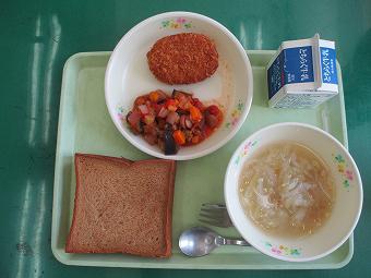 給食は、黒食パン、コロッケ、ラタトゥイユ、オニオンスープ、牛乳でした。