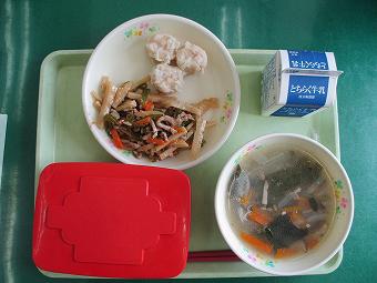 給食は、ごはん、エビシュウマイ、チンジャオロース、冬瓜スープ、牛乳でした。