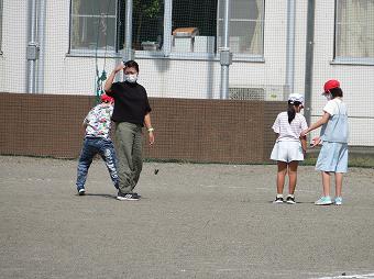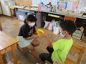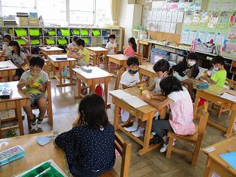 1年生が図工で「ふあふあゴー手作りうちわで」の学習をしました。今回は前時までに作り終えた作品を実際にうちわであおいでみんなで楽しく遊びました。