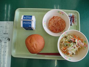 給食は、冷やし中華、ハムカツ、ミニ丸パン、牛乳でした。
