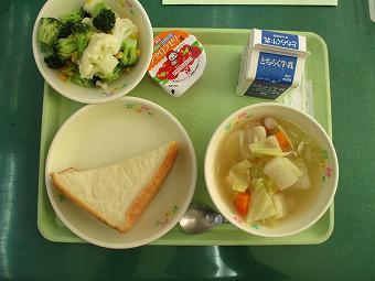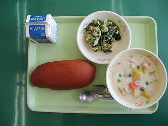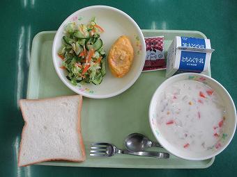 食パン、チョコ、オムレツ、コールスローサラダ、クラムチャウダー、牛乳でした。