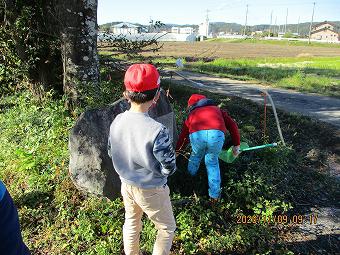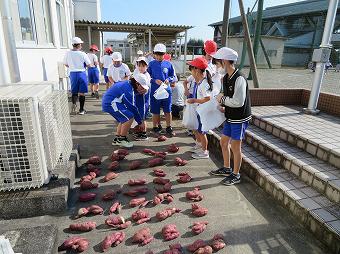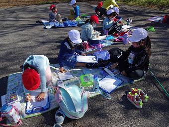 2年生が図工の学習「ちきゅうからのおくりもので」をおこないました。校庭をカンバスにして、自然のものを使っての創作です。どの子も想像力をたくさん働かせて、楽しい創造物をつくっていました。
