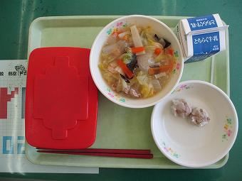 給食はごはん、海苔和え、納豆、石狩汁、牛乳でした。