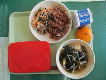 今日の給食は、ごはん、セルフビビンバ丼、韓国風スープ、みかん、牛乳でした。