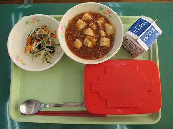 給食は、ごはん、ナムル、麻婆豆腐、牛乳でした。