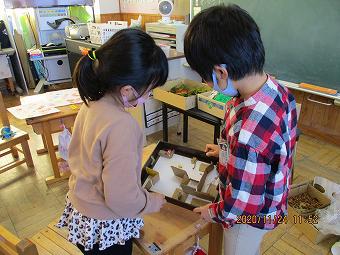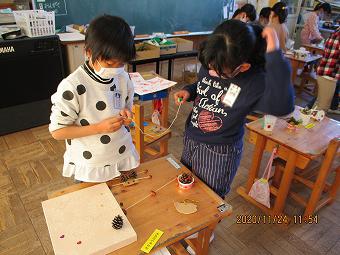 1年生が生活科で集めた秋のものを使って、創作を行いました。どんぐりや落ち葉などから発想を広げて、楽しい創作物を作っていました。