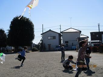 1年生が生活科で昔の遊びとして、凧揚げを行いました。自分で作った凧を、真っ青な空に楽しそうにたなびかせていました。