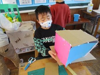 4年生が図工で「パックパグ」の学習をしました。さまざまな容器や色紙を使って、かたちあるものを創造していく学習です。どの子も一生懸命取り組んでいました。