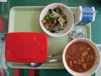給食は、チキンカレー、こんにゃくサラダ、ミニフィッシュ、大麦ご飯、牛乳でした。