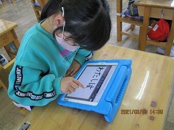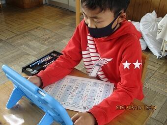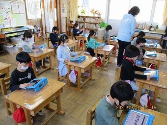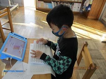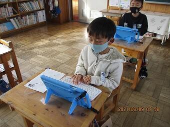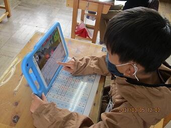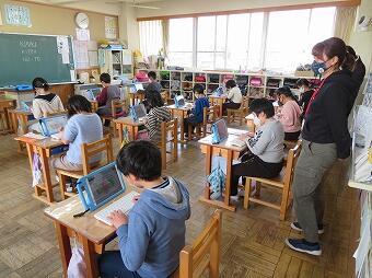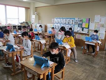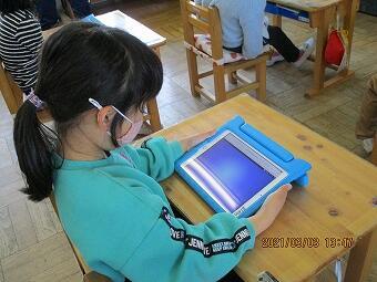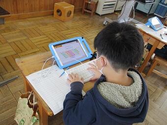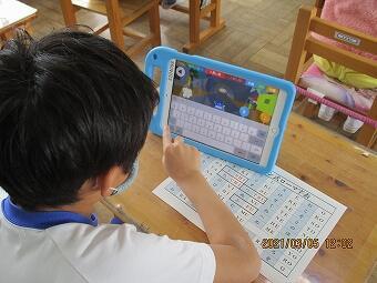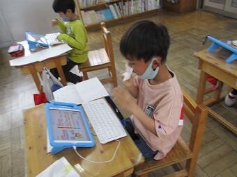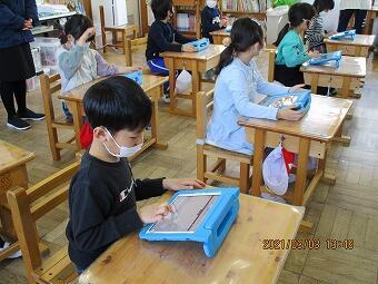 1年生がタブレットを使って、ドリル学習を行いました。初めてのタブレットによるドリル学習でしたが、どの子もすぐになじんで、自分のペースで意欲的に学習に取り組んでいました。