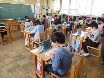 3年生と5年生がタブレットを活用した授業を行いました。3年生はローマ字打ちをしながら、自分自身で考えた文章を打つ学習を、5年生は算数の応用問題をタブレットを活用しながら考える学習を行いました。大学生からタブレットを活用した授業を参観したいとのリクエストがあり行いました。