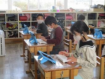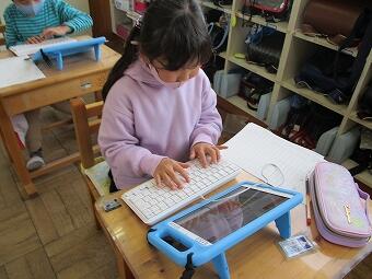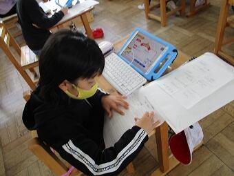 2年生は毎日、朝の学習でタブレットを使いローマ字打ちの練習をしています。子供たちは、学校にくると自分のタブレットを保管庫から取り出して自分のキーボードを取り付け、さっそく練習を始めます。どの子もこの学習がとても好きです。