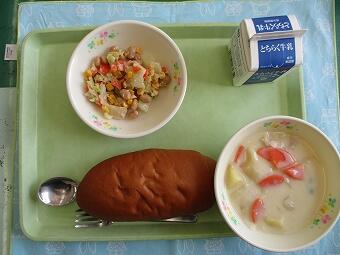 給食は黒パン、ツナと大豆のサラダ、クリームシチュー、牛乳でした。