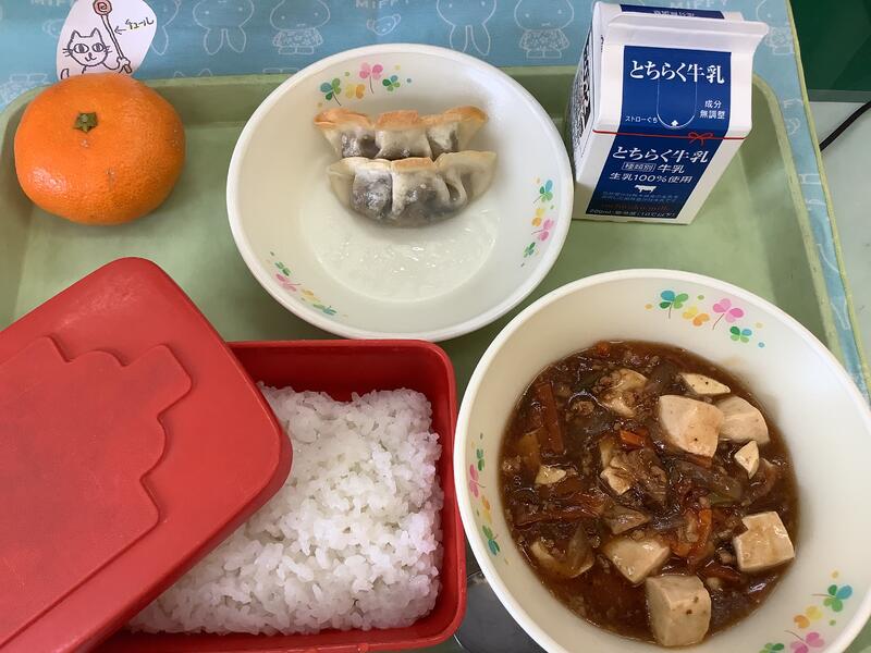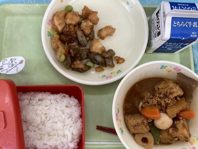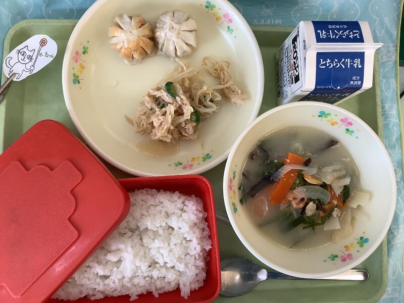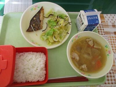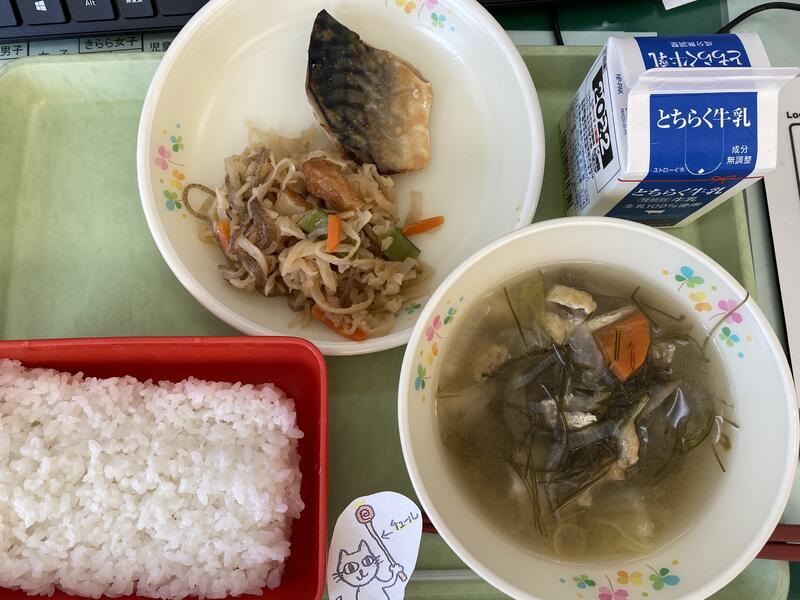 今日の給食は、ごはん、牛乳、ミナミカマス照り焼き、塩昆布あえ、豚汁の「塩ジョイランチ」でした。