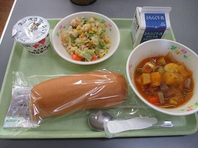 今日の給食は、県産小麦コッペパン、いちごジャム、牛乳、インド煮、かんぴょう入りサラダ、県産ヨーグルトの「さつきランチ」でした。
