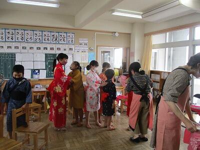 5年生の総合的な学習の時間にKLVさんに来ていただき「千葉省三」作『高原の春』の「影絵と読み聞かせ」を見せていただいた後、作品に出てくる「大正期の道具や衣装」について教えていただきました。