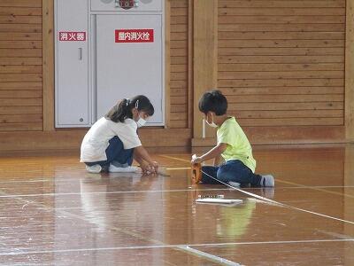 学校を思いっきり使って「長さ」の勉強です。自分の生活に関連させて、もののいろやかたち、手触りや匂い、温度、音や風、様々なものを感じながら学習することは、好奇心を高め、冒険したり、柔軟に考えたり、創造したりする心を育てる上で、とても大切なことだと思います。