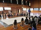 本校の特色である「児童文学者千葉省三ゆかりの地」をテーマに、千葉省三の作品を小杉さんにも読んでいただき、作品のイメージを「書というかたち」で、実演していただきました。また、毛筆を習う3年生以上は書道講座で自分の感じた作品の思いを、体験したことのない大きな紙に書き、学年ごとの共同制作としました。