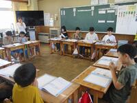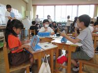 今日のめあては文章の読み取りと、文章の感想を持ち、言葉を選んで友達に伝えること。グループになったり、タブレットを使ってお互いの考えを共有したりしながら一生懸命取り組んでいました。教育委員会の先生も見に来てくださいました。