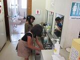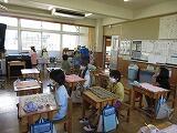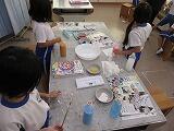 レンコンなどの野菜や洗濯ばさみなどに絵の具をつけて思い思いに作品作りをし、素敵な作品が出来上がりました。後片付けも協力して頑張りました。「水道を頑張って掃除しました」と校長室に声がかかったので見に行くととてもきれいになってました。