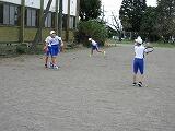 ベースボール型ゲームの学習です。バットやラケットを使ってボールを打つ練習をしています。今日は涼しいので校庭での体育日和です。