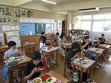 今日は給食の配膳の様子の紹介です。今日の献立は、ご飯、牛乳、あじ一夜干し、のりあえ、豚汁です。どの学年も手早く配膳しています。