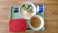 本日の給食の献立は、ご飯、牛乳、マグロカツ、のりあえ、のっぺい汁です。