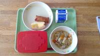 本日の給食は塩ジョイランチです。献立は、ごはん、牛乳、八宝菜、春巻き、りんごです。