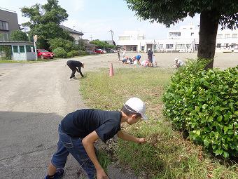 来週日曜日にはPTA奉仕作業が予定されていますが、自分達できれいにできるところはやろう!ということで、毎週木曜日、清掃の時間に全校除草に取り組んでいます。どの学年も自主的に自分達の場所に集まり、除草を始めました。小さな草を丹念に取り除いている子、大きな草を力いっぱい抜いている子。草を集めて袋詰めしている子。どの子も自分の役割を自分で決めて、一生懸命取り組んでいました。